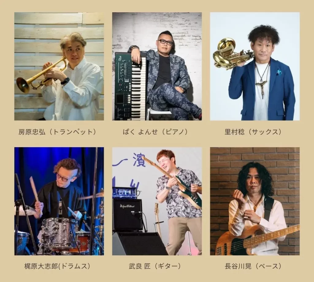 1977年から1992年にかけて毎年夏に開催されていた、日本のジャズフェスティバル「ライブアンダーザスカイ」その頃のジャズフェスの香りをもう一度と、亀岡ジャズフェスティバルの為に関西の一流プレイヤーに集まっていただきました。房原忠弘(トランペット)里村稔(サックス)をフロントに「ブレッカーブラザース」のナンバーを演奏していただきます。