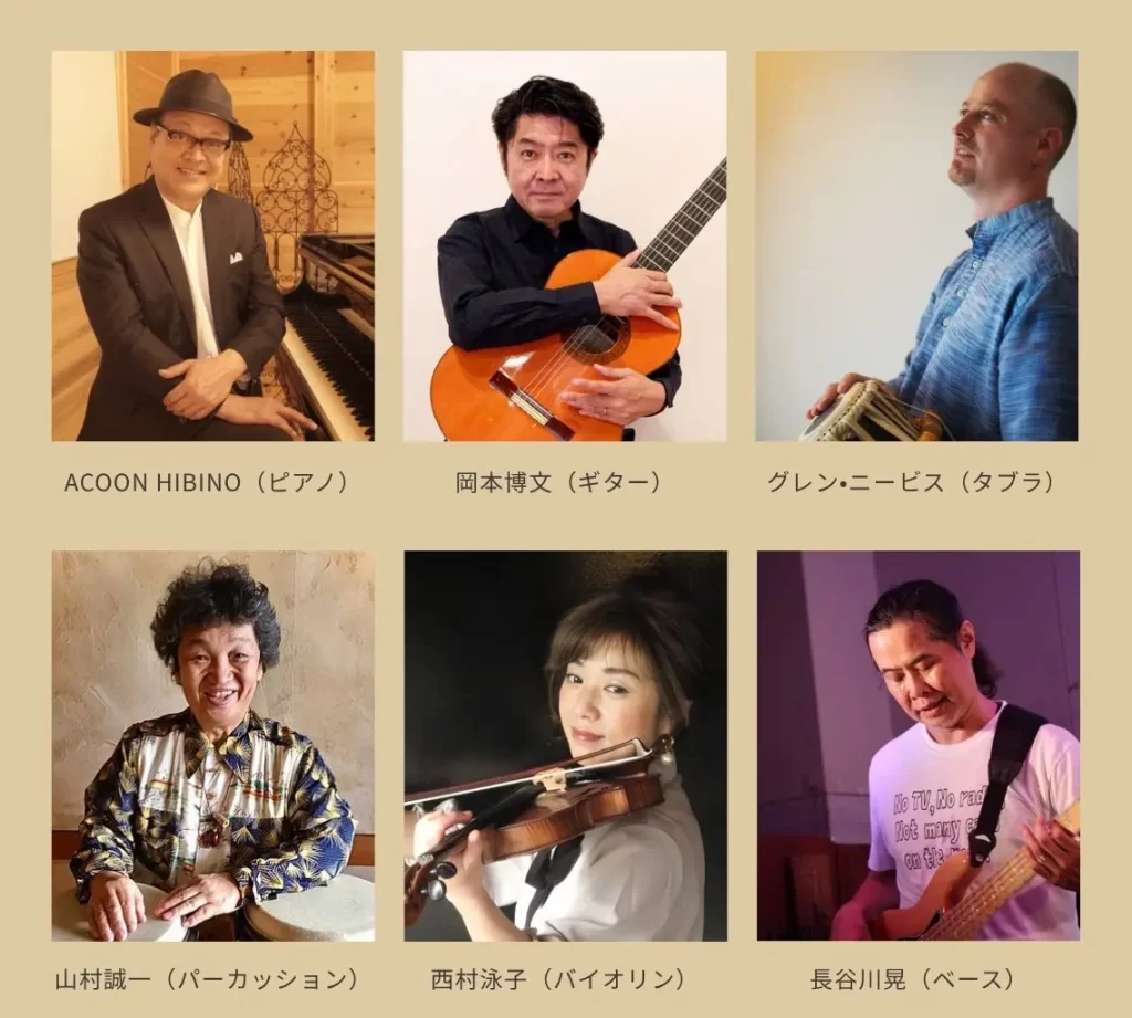 西村泳子のバイオリンをフロントに、インドの打楽器を含むユニークな6人編成。528Hzのヒーリングサウンドにクラシックや民族音楽のエッセンス、ジャズの即興を溶かし込み、「音でなければ出来ない言葉にならない表現」 がテーマの音楽の未来形を追求するバンド。2024年12月のコンサート動画「Dance」が発表から2ヶ月で46,000再生。チャンネル登録者10,000人を達成。今回は、長谷川晃(ベース)グレン・ニービス(タブラ)のサポートメンバーを迎えて。